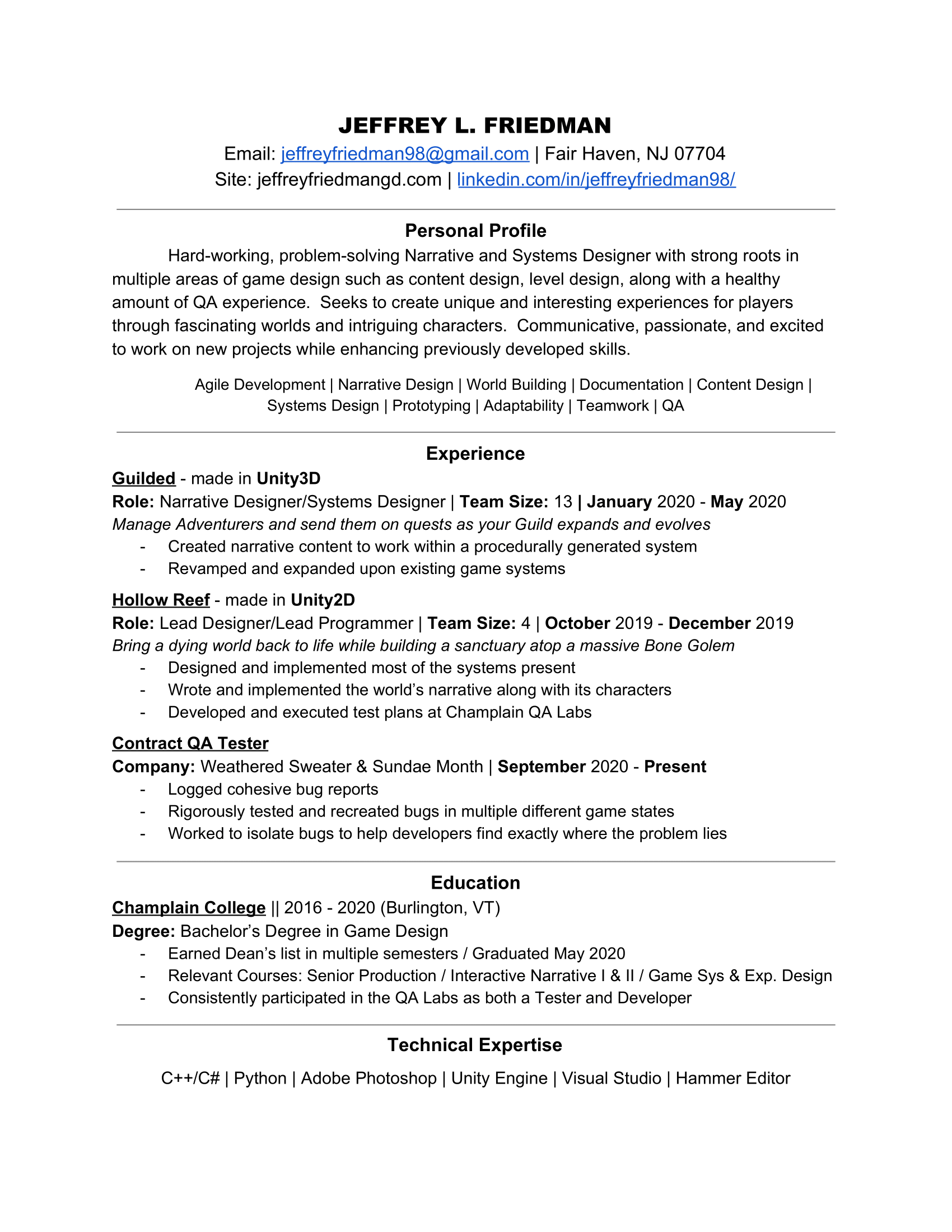 I’m Jeffrey Friedman and I am a Champlain College graduate with a BS in Game Design. My focus as a designer lies in narrative design and systems design, but I have knowledge of all aspects of game design. I also have a heavy interest in game QA testing. I am known for my communicative skills, my ability to collaborate, my up-beat attitude, and my passion for my work.